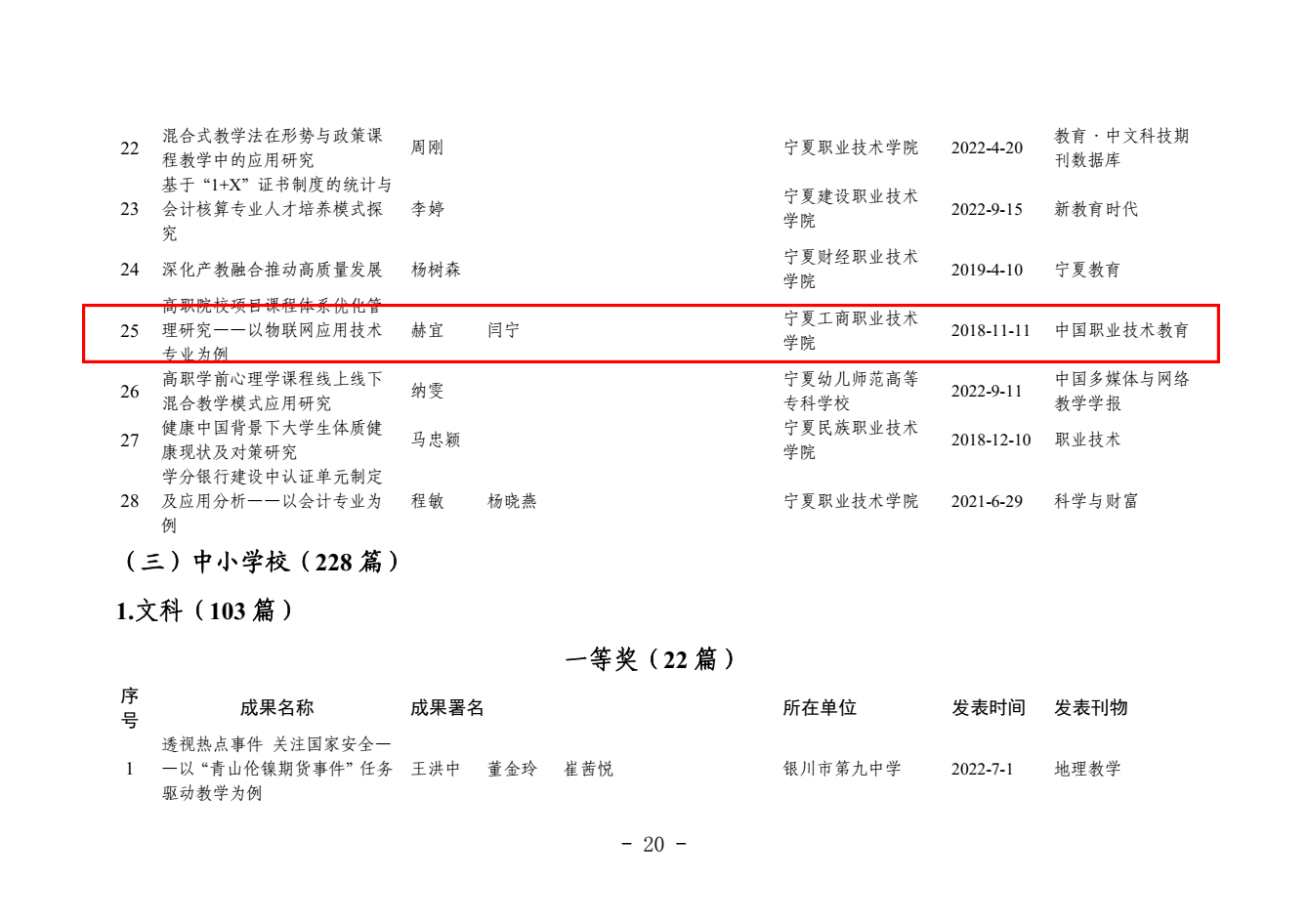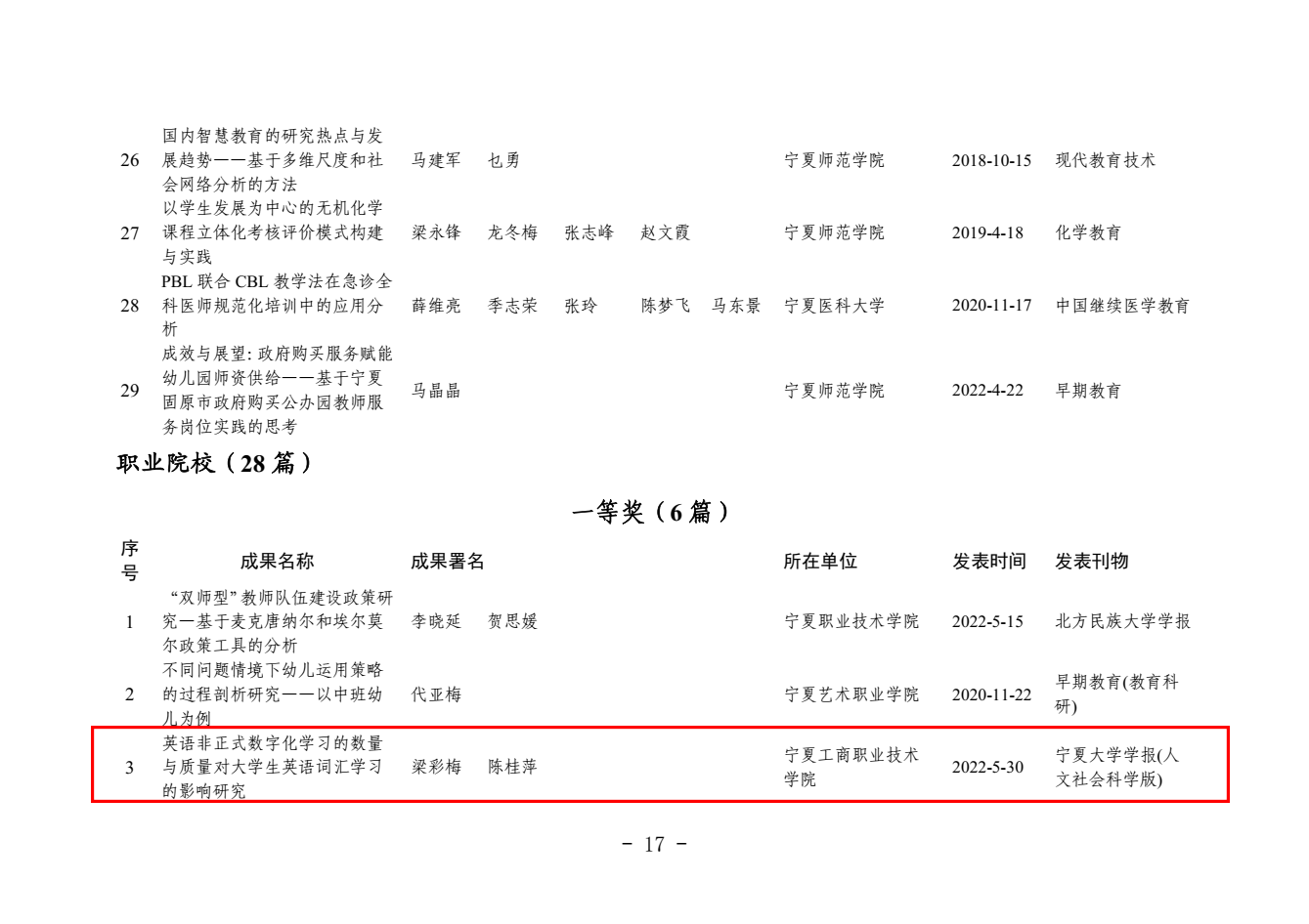 其中,梁彩梅申报的《英语非正式数字化学习的数量与质量对大学生英语词汇学习的影响研究》,何万丽申报的《宁夏职业院校专业设置对接九大重点产业的发展现状与对策建议》获论文类一等奖,关世春申报的《职业教育课程思政融入路径研究》获论文类二等奖,张俊义申报的《“双高计划”背景下高等职业教育专业群课程建设研究》,赫宜申报的《高职院校项目课程体系优化管理研究——以物联网应用技术专业为例》获论文类三等奖,张清林申报的《“十四五”时期宁夏技能型人才培养与发展问题研究》获课题类三等奖 向日葵视频下载app。